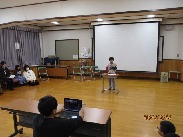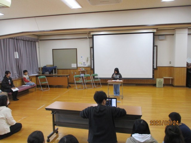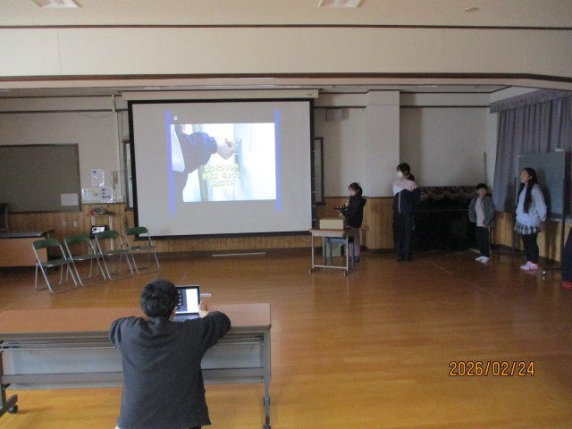 「くすのきの合言葉」をみんなで言った後、「きずな作文」の発表がありました。代表委員会・放送委員会からの発表もありました。