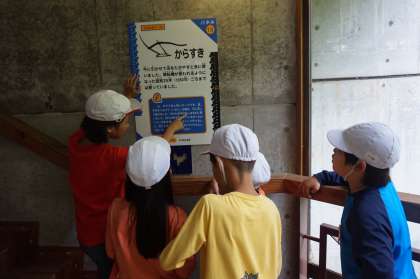 グループごとにパズルのピースが合う型のボードを探します。ぴったり合えば,そこに書いてあるクイズに答えるのですが,そのクイズが難しくて,子ども達はヒントを求めてまたボードを探しに行きます。グループで協力して,2回目に挑戦しているグループもたくさんありました。