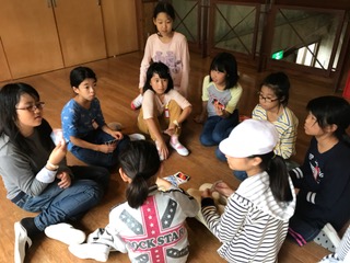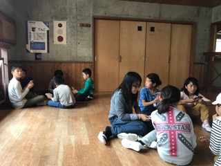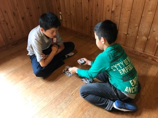 雨は止んでいますが,外で過ごすことができません。その分,室内で楽しんでいます。15時からは野外炊事の準備が始まります。