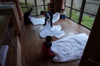 山の家4日目,最終日です。6時起床ともに,荷物の片づけとシーツたたみ等の寝具の片づけが始まりました。部屋ごとに協力しながら「感謝」の気持ちを込めてがんばっています。今日は昼から雨でできなかった冒険の森フィールドアスレチックもする予定です。