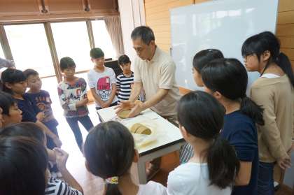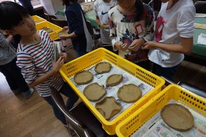 最終日,午前は花脊焼きのお皿を造りました。グループの代表が師匠に教えてもらったことを,みんなに伝えながら粘土で形を造っていきます。自分で好きな形や模様を工夫しながら仕上げました。