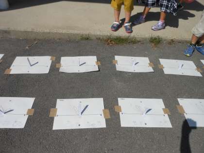 理科では,「太陽の動きと地面のようすをしらべよう」の学習をしています。影の長さは時間によって変わるかや,影のできる位置は時間によって変わるかを予測した後,1時間ごとに影と太陽の位置を記録しました。記録した事から予測と違っていたかどうかをまとめていきます。