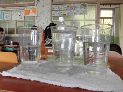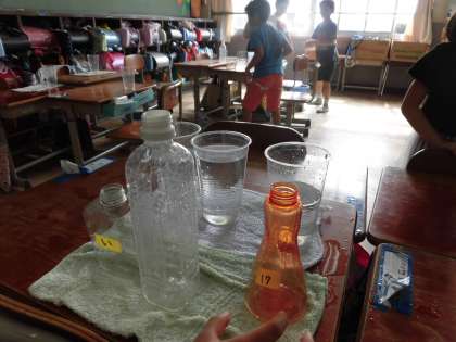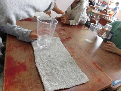 前回は2つの容器で直接比較したのに対し,今日は容器を3つに増やし,カップを使って間接的に比べられるようにしました。