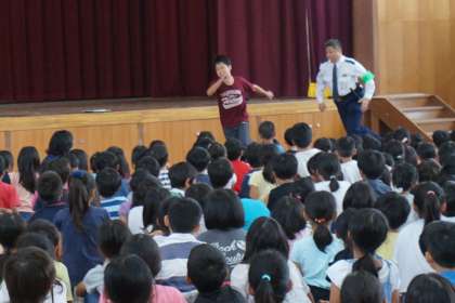 訓練後は体育館に集まって,伏見警察の方から自分の身を守る方法を教えていただきました。「不審者との距離をとる」「大きな声で助けを呼ぶ」「逃げる」など,もしもの時に役立つ大事なことをたくさん教えていただきました。