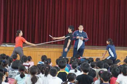 10月11日(水)2時間目に不審者が校内に入ったという設定で防犯訓練をしました。通用門付近では教職員が不審者に「さすまた」などで対応し,110番通報するという訓練をし,各教室では子ども達が入口を机でふさぎ,静かに待機するという訓練です。