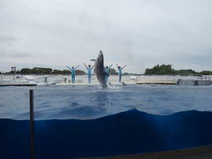 京都水族館に入り,まずはイルカスタジアムへ向かいイルカショーを観ました。「水がかかってもいいから前で観たい!」というグループは前の席へ,ゆっくり観たいグループは後ろの方へ。イルカ達のかわいい鳴き声や華麗なジャンプに大歓声のみんなでした。