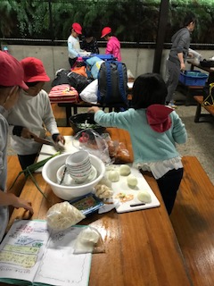 野外炊事をしています。今日は牛すき焼きを作ります。