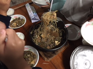 みんなで作った牛すき焼き,とてもおいしくできました。口に入れた瞬間,笑顔が溢れていました。