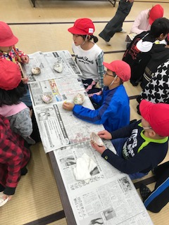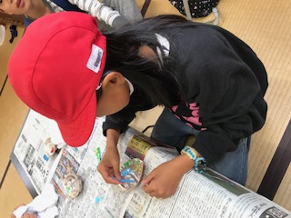 磯観察ができないため,急遽,鮑の貝殻にペイントすることになりました。鮑の貝殻はピカピカしていて綺麗なので,子ども達はとても嬉しそうでした。貝殻の中に想い想いのメッセージや絵を描きました。