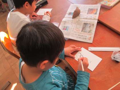 「つのみたいにとがってる!」「・・・ひげ、はえてるで。」と形や特徴をみんなで確認した後,割り箸ペンで形を描きました。