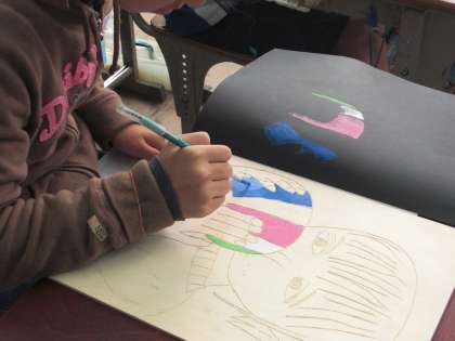 白色を混ぜたほうが,あざやかな刷りにしあがるので,しっかり白色をまぜながら刷っています。(白色の絵の具がたくさん必要になるので用意お願いします。)