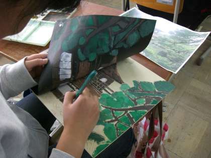 図工の一版多色刷り版画は,そろそろカラー刷りの作業に入ってきています。テーマに選んだ写真を見ながら丁寧に色をつくり,少しずつ版木に色をつけてはしっかりこすって版画和紙にうつしています。