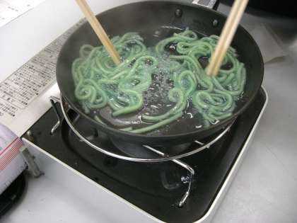 みるみるうちに,麺の色が「緑色」に・・・。