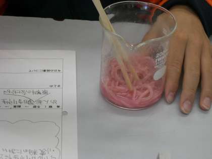 最後にアルカリ性の麺に酸性の塩酸をかけて反応を確かめました。一瞬で麺の色は「ピンク色」に変わっていきました。