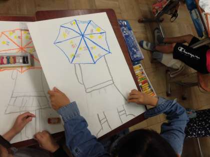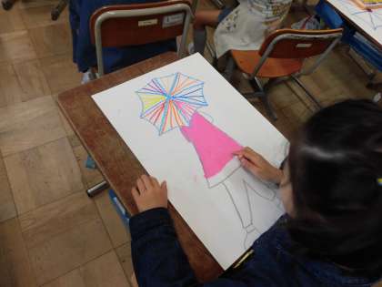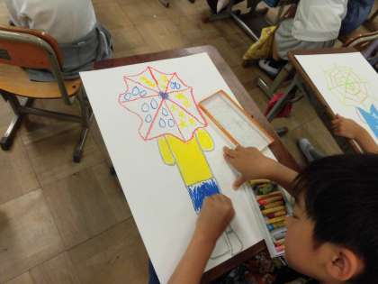図画工作科で,雨の日に傘をさしている自分を描いています、傘の部分はパスで模様を描き,この後絵の具で色を塗っていきます。世界に一つだけの自分の傘はどんなものに仕上がるでしょうか。完成が楽しみですね!