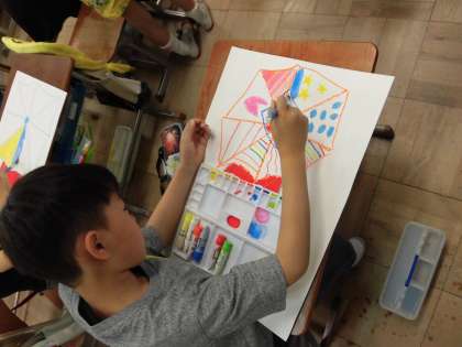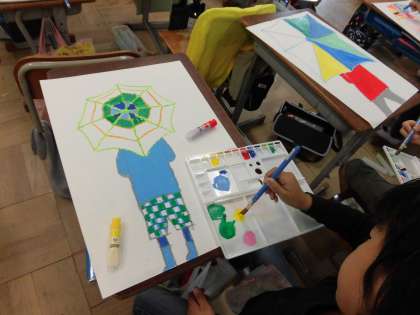 図画工作科で取り組んでいる「雨の日の自分の絵」ですが,傘の部分を絵の具で塗る段階に入りました。それぞれが思い思いの傘に色を塗り,世界に一つだけの傘が出来上がってきました!