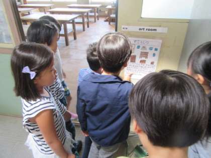 まだいったことのない教室や,初めて見るものに興味津々の1年生でした。