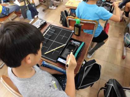 今日は初めて毛筆の学習をしました。まずは用具の名前を知り,置き場所や扱い方を確認しました。まだのりが付いている筆を水に浸けて,穂先を整える練習をしました。次の学習からは墨液を使って,半紙に書いていきます。