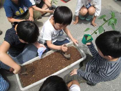 プランターを用意して土を入れ,みんなが見守る中,丁寧にポットから