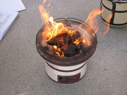 学習のまとめとして,当時の人々の暮らしの工夫と苦労を実感することをねらいに,七輪で火をおこす体験をします。