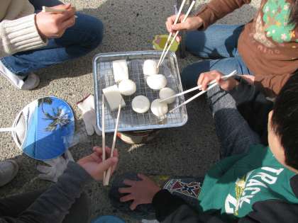 中庭では,3年生が,七輪で上手に炭をおこし,お餅を焼いています。