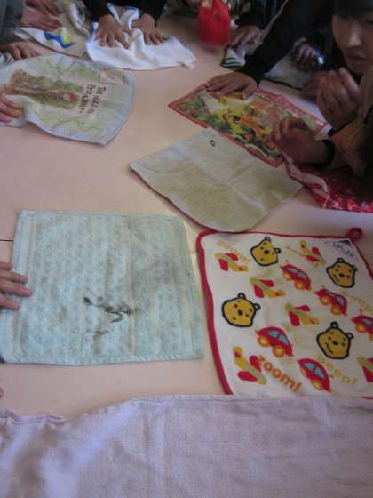 「どれだけ汚れがとれるか,試す」とみんな,タオルを運動場や机で