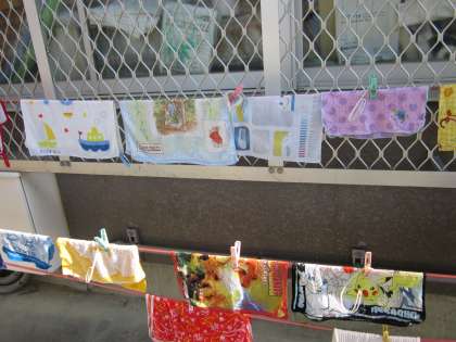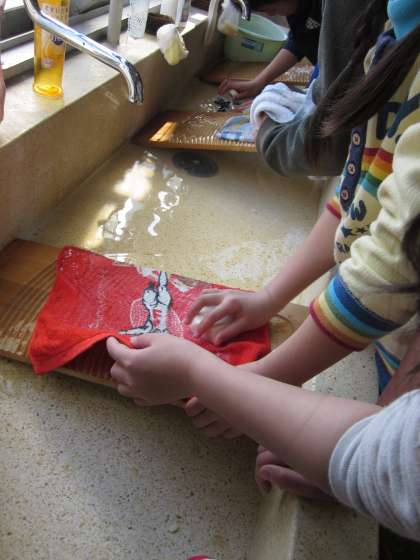昔の道具体験,第2弾として洗濯板を使って,タオルをあらいました。