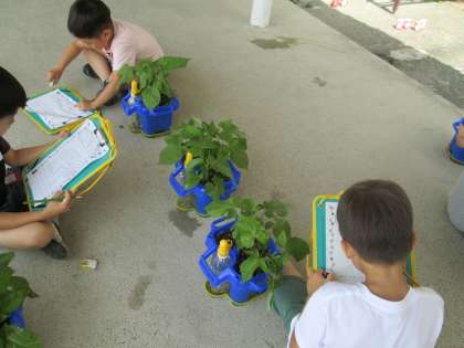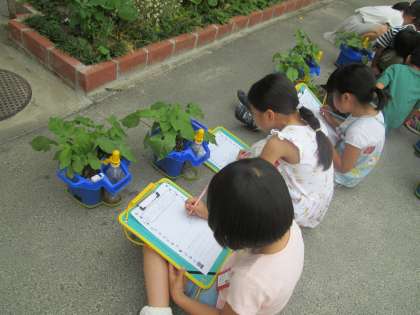 今日は1時間目にアサガオの観察をしました。先週間引きをしましたが,その後もぐんぐん成長しています。前回芽を観察したときと比べて,葉の形がぎざぎざになっていることや,枚数が増えていることなどに気が付くことができていました。