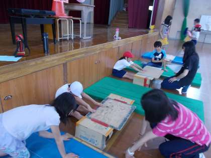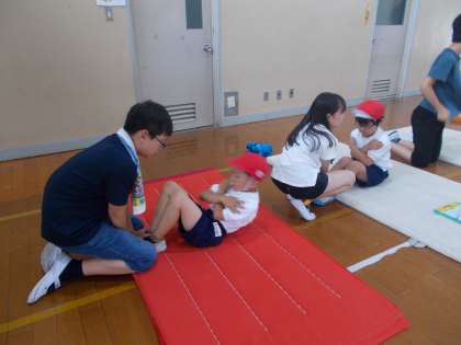 今日の1時間目に,初めての体力テストに挑戦しました。6年生のお兄さん・お姉さんに手とり足とりやさしく教えてもらいながら,立ち幅跳び,上体起こし,長座体前屈の3種目に取り組みました。初めは緊張していた人もいましたが,やり方がわかると一生懸命に取り組み,みんな最後までやりきることができました。よくがんばりました!