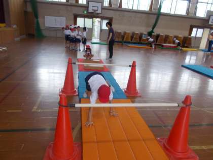 先週から,体育科で「マットあそび」をしています。ぴょんぴょん川とびゾーンやアニマルゾーンなど,いろいろな場を設定して,川とびやどうぶつ,前転,後転などの動きを楽しく練習しています。