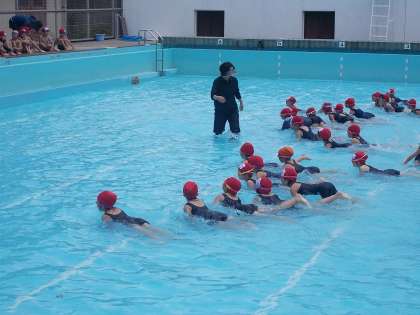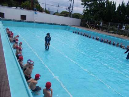 今日の3・4時間目に,低水位での水遊びをしました。水着への着替え方や体操の仕方,入水の仕方など,初めて勉強することがたくさんありました。プールでは,ワニさん歩きや水かけ遊びなどをして遊びました。水は少し冷たかったですが,子どもたちはとても喜んで水遊びを楽しんでいました。