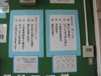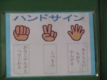 ハンドサイン・声の物差し・話し方名人・聞き方名人など,話し合い活動を活性化させ,コミュニケーション能力を培うために,全校でモデル化したマニュアルです。