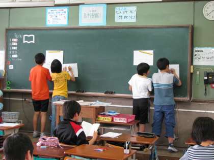 漢字のスキルアップに励んでいるクラス,算数・国語のプリントを選択し,黒板に張り出してある解答で結果を自力で確認しているクラス,自分で繰り返し練習したい課題を決めてドリルを中心に自学自習に励んでいるクラス。