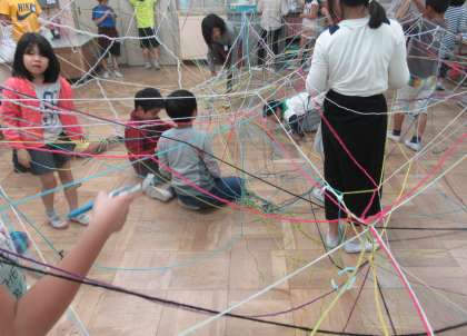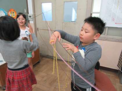 図工の学習で,ひもを工夫してつないだり,つないだひもからいろいろな形を見つける学習をしました。「三角ができた!」「雪の結晶みたいな形があったよ!」と面白い形をたくさん,見つけながらたのしんでいました。