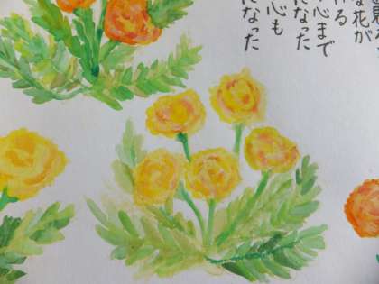 教室の後ろには,春の花の絵と,それに添えられた自作の詩が書かれた作品が掲示されていました。