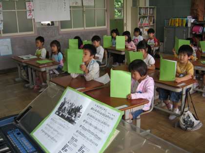 今,音楽の時間に「6月のつどい」のときに歌う「グッデイグッバイ」と「手と手と手」の歌を練習しています。どちらの歌もすてきな歌で子ども達は喜んで歌っています。