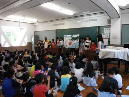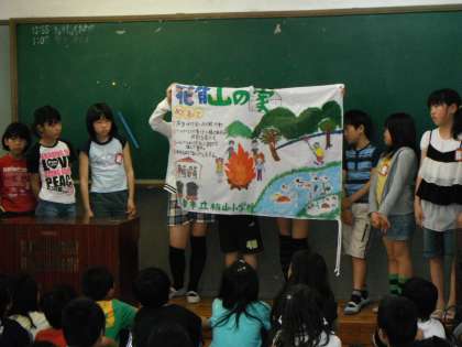 今日は、生活係が中心に制作した「みんなの旗」が出来上がり、みんなにお披露目をしました。
