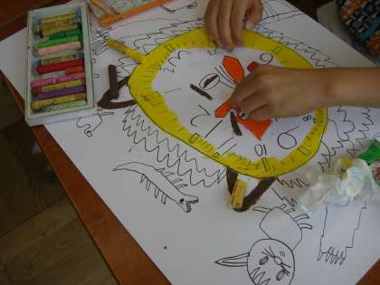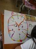 時間の学習をしたばかりなので,「時計」を題材にした絵を描いています。