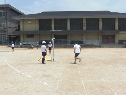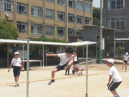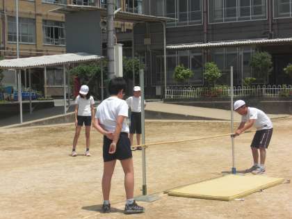 運動場の体育では,走り高とびの学習をしています。