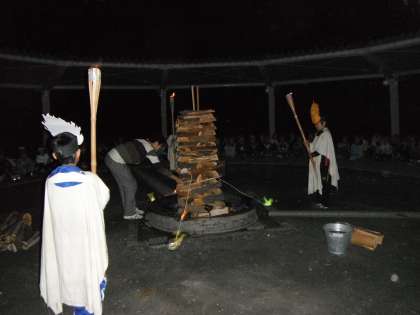 火の神からもらった大切な火を、神の子どもたちが高く詰まれた薪に点火します。