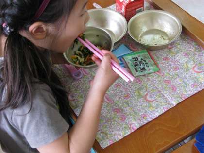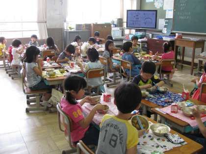 ご飯粒を残さないように上手にお箸を使って食べている人,野菜もバクパク,もりもり食べている人。どの学級も,とてもお利口に楽しそうに食べていました。