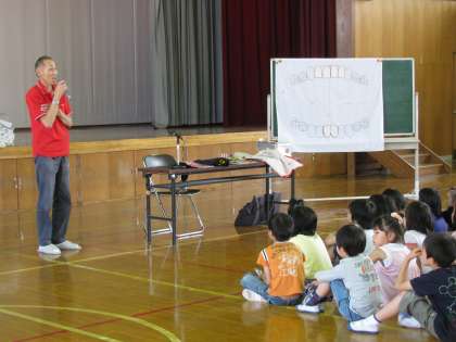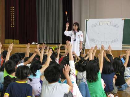 歯科校医の先生と,歯科衛生師の先生をお招きして,2年生が体育館で,歯の大切さを知り,ずっとずっと自分の歯で暮らしていけるよう,正しい歯磨きの仕方を教わりました。
