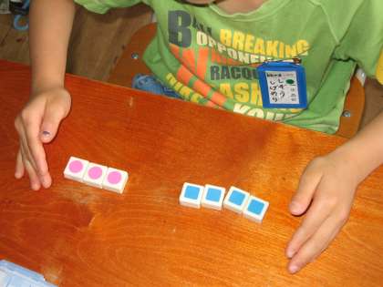 算数の学習は「たしざん(1)」にはいりました。まずは,数図ブロックを操作する活動を通して,合併の場合のたしざんの意味を考えました。子ども達は数図ブロックを操作しながら,「3びきと2ひき あわせて5ひき」などといいながら学習しました。