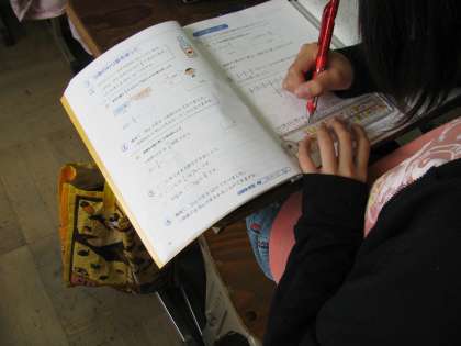 すでに習慣付けができている様子で,手早く全員が,左端に教科書やノーをと重ねていました。手元を整えて学習させるのは,大事なことだと思います。