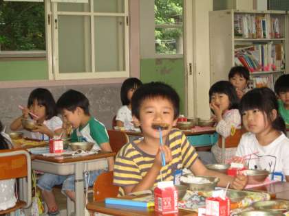今日の給食の献立は「さわらのたつた揚げ」と「キャベツのごまあえ」「みそしる」「ごはん」「牛乳」でした。先日「にしんなす」で苦労していた子ども達ですが,今日の「さわらのたつた揚げ」は一口食べるや「おいしい1」「これ,から揚げの味がする」とにこにこ顔でした。「キャベツのごまあえ」もキャベツの甘みがよくでていてとても好評でした。ぺろりと平らげた子ども達でした。