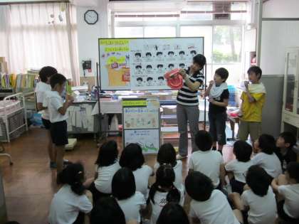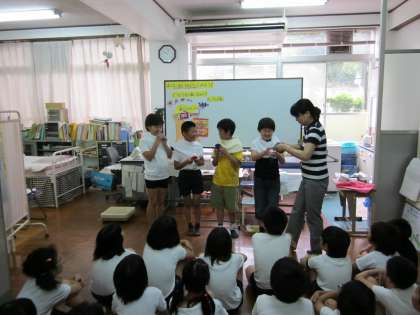 4年生は「めざせ はみがき名人!!」ということで相楽先生にお話をしていただきました。実際にカラーテスターを使って,上手な歯みがきの方法を教わったり,どうしてむし歯かできるのかについて考えたりしました。