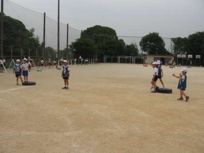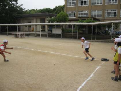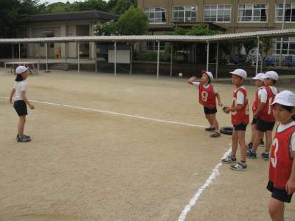 今日も朝からあまりすっきりしない天気で、「雨大丈夫かな?」「ハンドベースボールできるかな。」と心配していましたが、曇り空の中ゲームをすることができました。