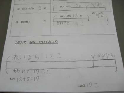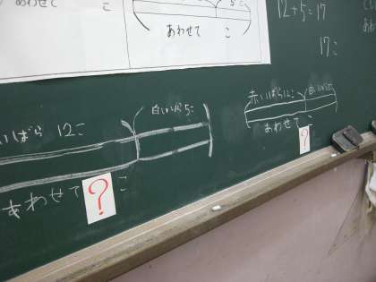 今日の算数では,文章題をとくときに,テープ図をかいて式を考える学習をしました。これまでなら,ブロックを並べて考えていたことを,テープ図に表すのです。