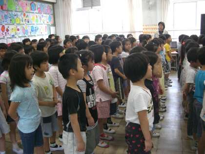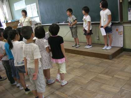 今日は明日の交流に向けて最終確認です。歌を歌ったり,代表で言葉を言う人がみんなの前で練習したり,自分のグループを確認したりしました。