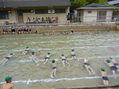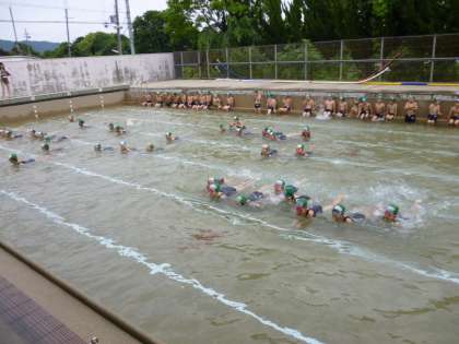 プールが始まりました。三年ではじめてのプールに子どもたちはとても大喜びでした。水になれるためにアヒルやワニやカニになって泳ぎました。